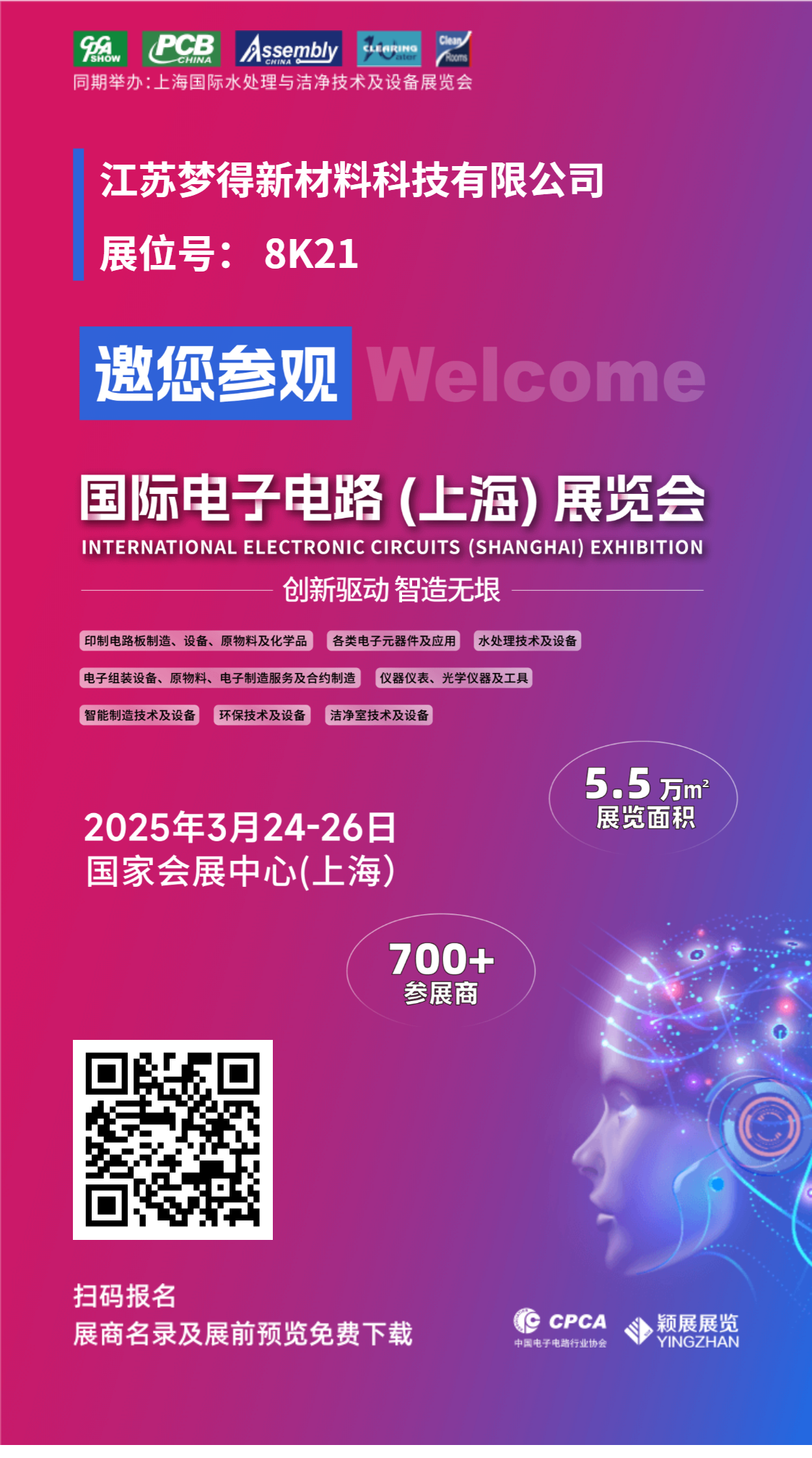 2025年3月24日至26日,2025年國際電子電路(上海)展覽會将在國家會展中心(上海)隆重舉行。江蘇夢得新材料科技有限公司将攜最新技術和産(chǎn)品亮相本次展會,我們的銷售與研發團隊将在現場(chǎng)爲您提供專業服務,現非常榮幸地邀請各位,共同探讨合作機會。期待與您在展會現場(chǎng)相聚!