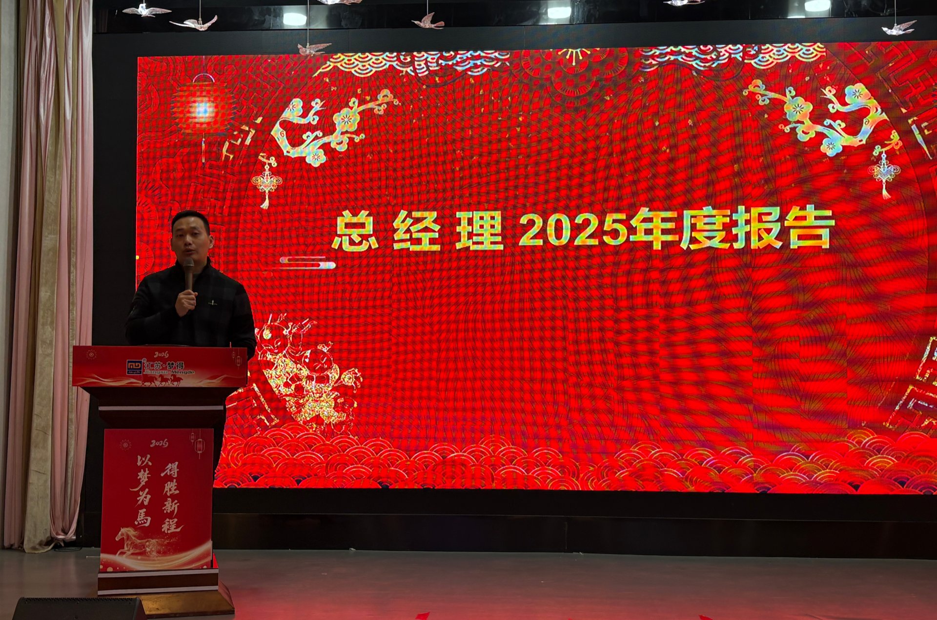 佳績的背後,離不開領導班子的高瞻遠矚,更凝聚著(zhe)每一位夢得人的拼搏與堅守。總經理杭康先生的年度報告,既是對過往的複盤,更是對未來的宣言。他用一組組詳實的數據、一個個亮眼的成果,回顧瞭(le) 2025 年江蘇夢得的輝煌成就與成長足迹:從核心産品的技術突破到市場份額的穩步擴張,從團隊凝聚力的持續增強到品牌影響力的不斷提升,每一份成績的背後,都凝聚著(zhe)全體夢得人的汗水與堅守。同時,杭總深刻剖析瞭(le)行業發展趨勢與市場機遇,清晰擘畫瞭(le) 2026 年的宏偉藍圖,提出瞭(le)切實可行的發展目标與戰略規劃。他強調,新的一年,全體同仁需繼續秉持公司核心價值觀,以 “行則必至” 的堅定信念,凝心聚力、勇攀高峰,共同書寫江蘇夢得更加璀璨的篇章。