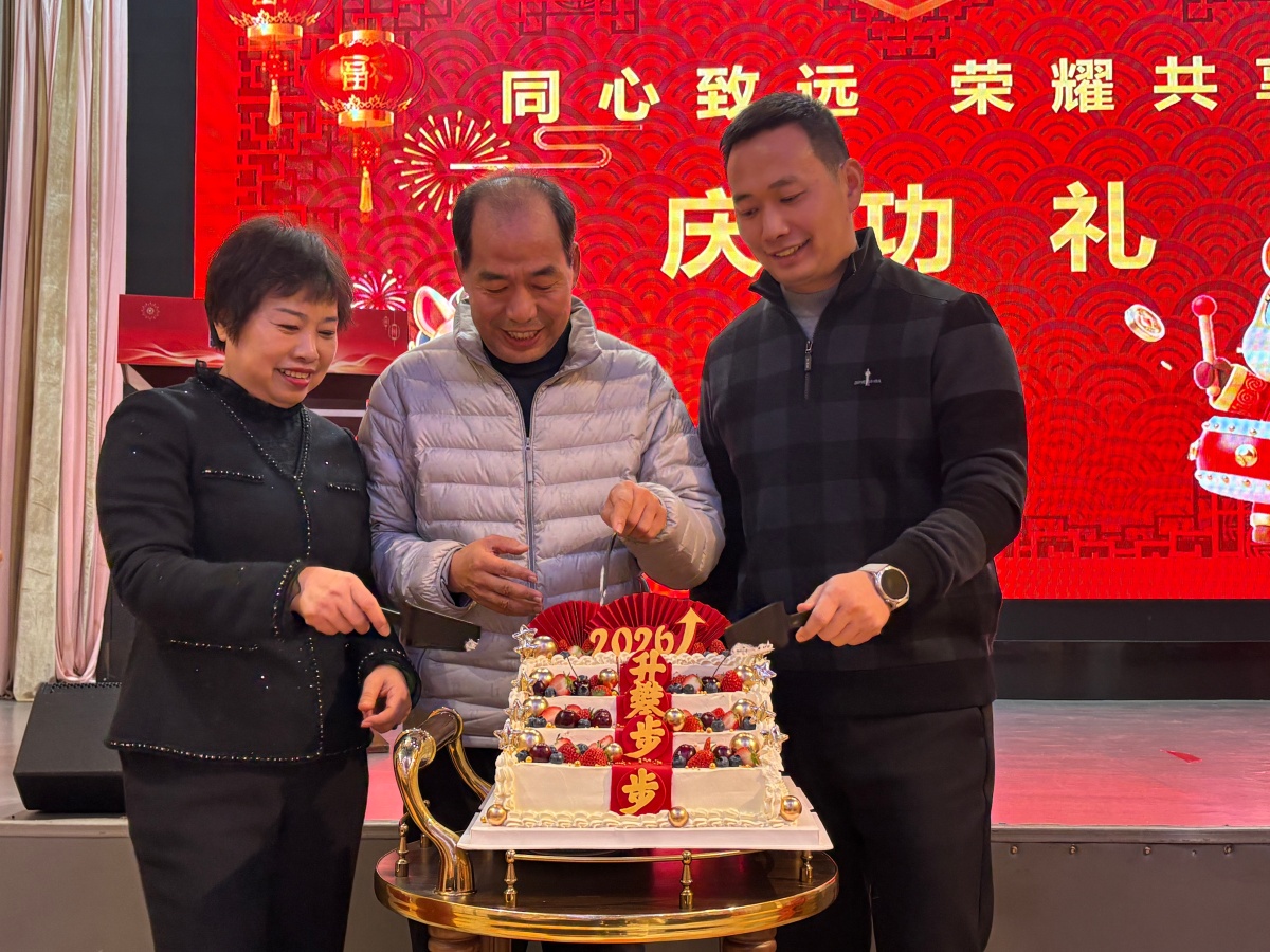 董事長杭冬良先生、總經理杭康先生、公司副總經理貢建華女士共同走上舞台,手持特制的刀具,在全場同仁整齊劃一的倒計時聲中,一同切開瞭(le)這象征著(zhe)團圓、喜悅與希望的慶典蛋糕。“3!2!1!” 當刀刃落下的瞬間,現場掌聲雷動、歡呼聲此起彼伏,閃光燈記錄下這一溫馨而神聖的時刻。這蛋糕,甜在舌尖,暖在心底,不僅是對過往堅守與付出的犒賞,更是責任與傳承的象征,是夢得人同心同德、共赴未來的美好見證。願江蘇夢得如這蛋糕般層層遞進、蒸蒸日上,2026 年續寫更多輝煌篇章;願每一位夢得人都能共享公司發展成果。